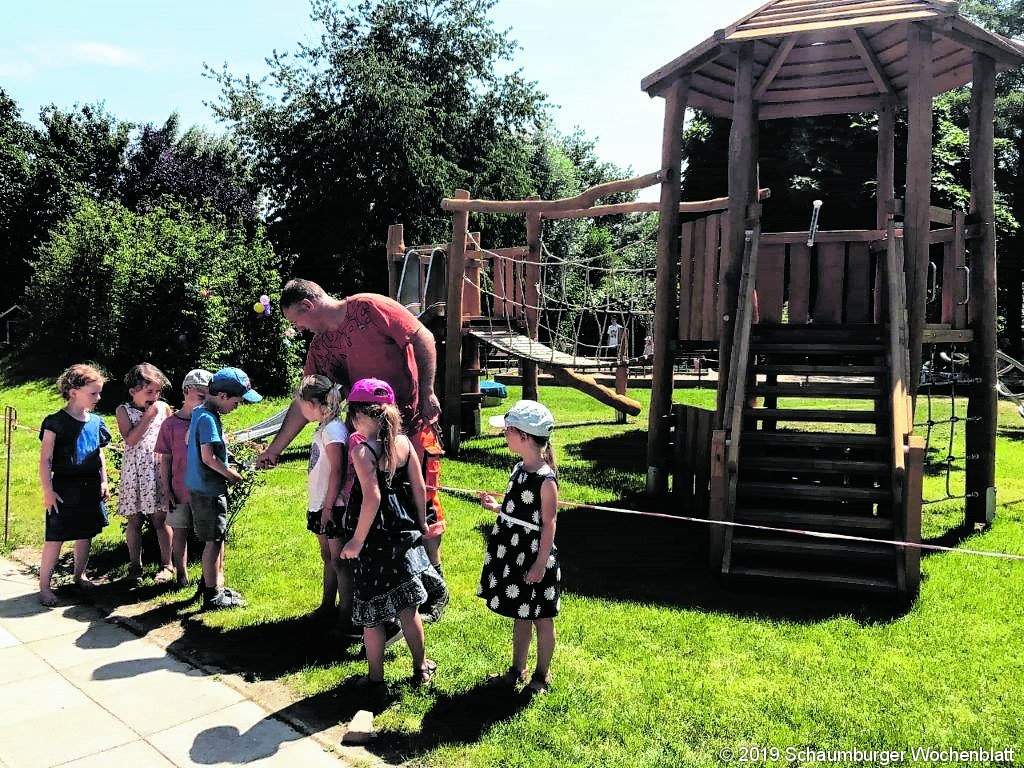 HASTE (jl). Das Warten hat ein Ende: Im Januar 2019 fertiggestellt, dürfen die jungen Abenteuer der Integrativen Kindertagesstätte in Haste ihr umgestaltetes Außengelände jetzt in vollem Umfang erobern. Das naturnahe Konzept der Garten- und Landschaftsgestaltung beinhaltet mehrere neue Spielgeräte, die sich in Form und Farbe der Natur anpassen, sowie einen begrünten Spielhügel mit neuen Hainbuchenelementen und einem neuen Rasen. Die frische Aussaat hatte dazu geführt, dass die Kinder einen Teil des Geländes noch nicht betreten und bespielen durften. Umso größer war jetzt die Freude, als sie gemeinsam mit Bauhofmitarbeiter Dennis Buhr die letzten Absperrungen entfernten. Sofort nahmen die ersten den neuen Spielturm in Beschlag. Rückzugsplätze, Tunnel, Hügel und Hecken als "Raumteiler" gliedern das Außengelände nun in verschiedene Funktionsbereiche. Das regelmäßige Überqueren der neuen Wackelbrücke beispielsweise schult den Bewegungsapparat und das Körperbewusstsein. Einige Spielgeräte, wie die Nestschaukel, fördern durch die gemeinsame Nutzung die Kommunikation der Kinder und somit die sozialen Fähigkeiten. Schaukeln, Rutsch-, Balancier- und Hangelmöglichkeiten, schiefe Ebenen, Wippe und Seil erhöhen den Erlebnischarakter des Geländes und sorgen für komplexe Bewegungs- und Spielabläufe der Kinder. Eine Wasser-Pumpe mit Matschwerkstatt steht sogar ganzjährig zur Verfügung. Der gut erhaltene, alte Baumbestand dient nicht nur als natürlicher Schattenspender, sondern auch als Aufhängung für Hängematte, Slackline und Schaukelring. Zwei Spielhäuser sind als Lagerplatz für Fahrzeuge und Sandspielzeug, aber auch als erweiterte Funktionsfläche nutzbar. Der große Sandkasten bietet Platz für viele Kinder. Zudem verfügt jede der vier Gruppen im Haupthaus über ein eigenes Nutzbeet, um Gemüse und Kräuter anzupflanzen. Mehrere Obst- und Nussbäume sowie der Naschgarten mit verschiedenen Beerensträuchern stehen allen Kindern für die gemeinsame Ernte zur Verfügung. Gleichzeitig werden dadurch Insekten, Vögel und andere Tierarten angelockt. In Insektenhotels, Nistkästen, Vogelhäusern und einem Igelhaus finden sie Unterschlupf. "Die Blühpflanzen wurden bewusst von den KiTamitarbeitern ausgewählt, um die jahreszeitlichen Veränderungen des Geländes darzustellen", heißt es in der entsprechenden Pressemitteilung. Foto: privat BUZ NE28JL33 01: Nach der naturnahen Umgestaltung des Außengeländes: Gemeinsam mit Bauhofmitarbeiter Dennis Buhr entfernen die Kinder der Integrativen Kita in Haste die letzten Absperrungen.