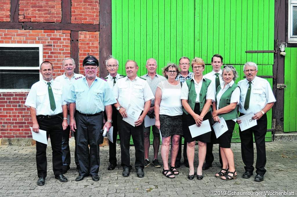 HORSTEN (jl). Wenn die Horster ihr Schützenfest - das, wie sie sagen, gemütlichste der Welt - feiern, haben sie meist Glück mit dem Wetter. So auch in diesem Jahr, als sie zwei Tage lang den Hochsommer auf ihrer Seite hatten. Der Drang sich zu bewegen hielt sich dementsprechend in Grenzen, ein schattiges Plätzchen wurde gern aufgesucht und der Geselligkeit gefrönt. Den Auftakt machte das Kinderfest. Etwas weniger als im Vorjahr, aber mit 26 Nachwuchsabenteurern zwischen 2 und 13 Jahren nahm dennoch eine stattliche Anzahl daran teil. An sechs Stationen sowie einer Bastelecke konnten diese ihr Können und ihre Geschicklichkeit unter Beweis stellen. Anschließend hieß es für das vorherige Königshaus Abschied nehmen. Die Königsketten wurden durch Ablöseorden ersetzt und an die neuen Majestäten weitergegeben. Die da wären: Jugendkönig Julien Kupka mit dem 1. Prinz Manuel Stiller und der 2. Prinzessin Jenny Kupka; Königin Christel Kuhnke mit ihren beiden Damen Monika Gützkow und Annette Gräber sowie König Jens Kupka mit seinen beiden Rittern Harald Grieger und Konrad Kruse. Ihr Schützenfest nutzen die Grünröcke traditionell auch, um langjährige Mitglieder zu ehren. Für 50 Jahre Zugehörigkeit erhielt Berthold Bolsewig die Auszeichnung, auf 40 Jahre blicken Rolf Steege, Sabine Bolsewig und Ute Stiller. Seit 25 Jahren dabei sind Detlef Wehrmann, Wilfried Stoppe, Heiner Laporte, Manfred Behrens, Jens Stock, Anita Oltrogge, Reinhard Prenger und Christian Oltrogge. Eine besondere Aufmerksamkeit wurde Corinna Brunzel und Frauke Last zuteil, die in Anerkennung ihrer Leistungen rund um den Schützenverein die Verdienstnadel in Bronze des Kreisschützenverbandes bekamen. Ein weiteres Festhighlight folgte tags darauf, als alle Teilnehmer durch den Ort marschierten, um die Königsscheiben aufzuhängen und ihre Majestäten abzuholen. Dabei warteten auf Schwakes Hof gleich zwei: Vater und König Jens Kupka mit Sohnemann und Jugendkönig Julien Kupka. Beide hatten zum ersten Mal den majestätischen Titel errungen. Mehr Erfahrung im "Königinsein" hat da Christel Kuhnke, die der Umzug anschließend aufsuchte. An den Giebel kam die nun mehr vierte runde Trophäe. Nach dem obligatorischen Ehrentanz und Umtrunk zog es die Teilnehmer zurück zur Festwiese, wo die Schaumburger Musikanten wieder kräftig einheizten. Foto: privat