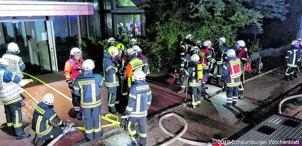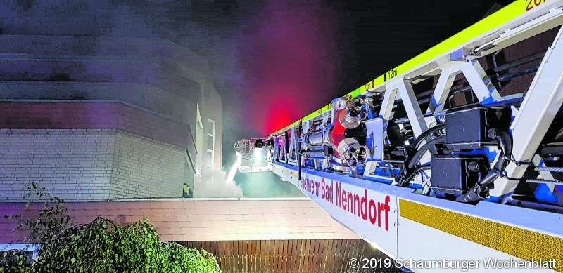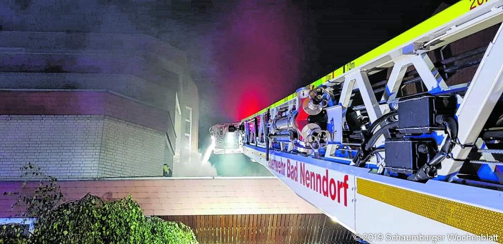 Durch Feuerwehr und Sicherheitsdienst wird daraufhin das gesamte Gebäude evakuiert und mit den Löscharbeiten begonnen. Verletzt wurde niemand. Nach ersten bisherigen Erkenntnissen der Polizei ist es vor einem Zimmer im zweiten Obergeschoss zu einem Brand gekommen. Dies ist vermutlich beim Zubereiten des Essens entstanden. Wie sich im Einsatz heraus stellte, geriet dabei auch die Fassade des Gebäudes in Brand und griff auf ein Zimmer im ersten Obergeschoss über. Von der Drehleiter aus wurde die Fassade abgelöscht, zwei Trupps unter Atemschutz bekämpften den Brand im Zimmer. Nach gut drei Stunden konnte der Einsatz beendet werden. Durch die Rauchgase sind mehrere Zimmer unbewohnbar und die Bewohner auf andere Zimmer verlegt worden. Die exakte Brandursache wird derzeit von der Polizei ermittelt. Im Einsatz waren 115 Einsatzkräfte mit allen Feuerwehren aus der Samtgemeinde Nenndorf, Kräfte der Feuerwehr Rodenberg, der Gerätewagen Atemschutz der Kreisfeuerwehr Schaumburg und der Rettungsdienst. Foto: p.