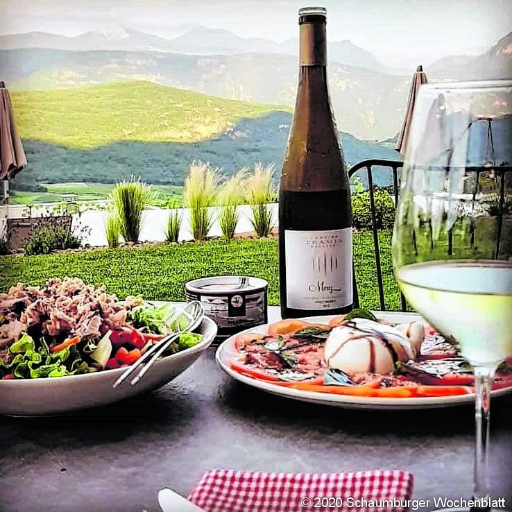 Genuss pur in Kaltern an der Weinstrasse in Südtirol, mit Blick auf das Weiss- und Schwarzhorn.A. Schlesies, Haste