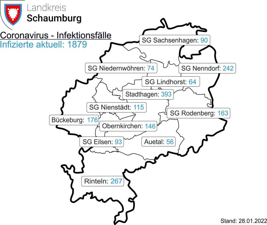 Mit Datum vom 28. Januar, 8 Uhr, sind im Landkreis Schaumburg 1.879 Menschen akut mit dem Corona-Virus infiziert. Die Zahl der Personen mit einer bestätigten Corona-Infektion ist im Kreisgebiet seit Donnerstag um 229 Personen auf insgesamt 11.267 gestiegen. Von diesen Gesamt-Infektionsfällen gelten jedoch 9.274 Personen inzwischen als geheilt. Alle akut infizierten Personen wurden isoliert und befinden sich in Quarantäne. Es stehen 603 Personen unter Quarantäne. Hinzu kommen weitere Infizierte, die nach der Absonderungs-Verordnung aufgrund eines positiven Testergebnisses zur Absonderung verpflichtet sind. Es befinden sich 15 Personen der Erkrankten in stationärer Behandlung. Zudem hat sich die Zahl der in Zusammenhang mit COVID-19 Verstorbenen im Landkreis Schaumburg um eine weitere Person auf 114 erhöht. Die verstorbene Person war über 90 Jahre alt. Am Donnerstag belief sich die Zahl der durchgeführten PCR-Testungen des DRK auf insgesamt 596. Mit Stand vom 28. Januar liegt die landesweite 7-Tages-Hospitalisierungsinzidenz (Neuaufnahmen COVID-19 Patienten) bei 7,7, die sogenannte 7-Tages-Inzidenz laut der rechtsverbindlichen Bekanntgabe des Robert-Koch-Institutes im Landkreis Schaumburg bei 919,2 sowie der landesweite prozentuale Anteil COVID-19 Erkrankter an der Intensivbetten-Belegung bei 5,3 Prozent.