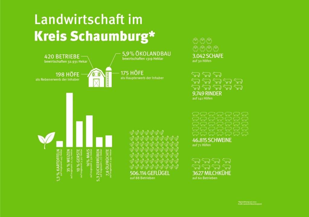 LANDKREIS (jb). 420 landwirtschaftliche Betriebe gibt es in unserem Landkreis. Insgesamt bewirtschaften sie rund 33.000 Hektar Land. Das zeigte die letzte Agrarzählung von 2020, deren Ergebnisse vor kurzem bekannt gegeben worden waren, wie das Landvolk Weserbergland mitteilte. Die durchschnittliche bewirtschaftete Fläche pro Betrieb liegt dabei bei rund 78 Hektar. 25 Betriebe betreiben zudem Ökologische Landwirtschaft. Rund 28.000 Hektar Ackerland gibt es in Schaumburg. Auf knapp 17.000 Hektar davon wird Getreide angebaut, davon sind um die 11.700 Hektar Weizen und etwa 3300 Hektar Gerste. Kartoffeln werden auf 443 Hektar angebaut, Hülsenfrüchte auf 215 Hektar und Mais insgesamt auf etwa 5300 Hektar. Zuckerrüben nehmen zudem rund 1800 Hektar ein und Pflanzen zur Grünernte - beispielsweise Gras oder Leguminosen zur Viehfütterung oder für die Biogasanlage - werden auf 5048 Hektar angebaut. Betriebe mit Viehhaltung gibt es in Schaumburg 267. Auf 141 von diesen Betrieben leben 9749 Rinder, auf 60 Betrieben sind etwa 3600 Milchkühe zu finden. Weiterhin gibt es im Landkreis rund 506.000 Hühner und rund 47.000 Schweine sowie weitere rund 3000 Schafe. Die genauen Daten können der nebenstehenden Grafik entnommen werden. Und übrigens: Zehn Prozent der Führungskräfte der Betriebe in Niedersachsen sind weiblich. Grafik: Landvolk Weserbergland