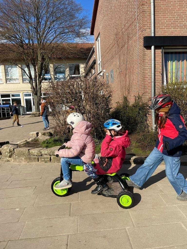 Bewegung und Spiel wird in der Grundschule Haste auch in den Unterrichtspausen sehr viel Raum gegeben und gefördert. Um beides zu ermöglichen werden immer wieder zusätzliche Spielgeräte zur Auswahl im Spielecontainer der Schule angeschafft. Sie animieren die Schülerinnen und Schüler zusätzlich und sorgen für vielerlei positive Eigenschaften. Jetzt konnte das Spielgerätangebot um zwei "Olifu-Taxis" erweitert werden, mit denen bis zu drei Kinder gemeinsam über den Schulhof fahren können. Möglich machte dies die finanziellen Unterstützungen des Rotary Club und des Fördervereins der Grundschule Haste. Die erste Testfahrt der neuen Bewegungsmittel durch Schüler der Grundschule verfolgten gemeinsam Sandra Domke, die Vorsitzende des Fördervereins, Britta Lehmann als kommissarische Schulleitung und Felix von Hantelmann für den Rotary Club.