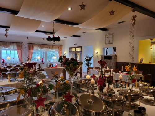 Im Rahmen eines Buffets haben Sie die Möglichkeit verschiedene Köstlichkeiten zu genießen: kalte Vorspeisen, 2 Suppen, Auswahl im Hauptgang u.a. Gänsekeule, Entenbrust, Wildragout, Rinderroulade uvm. mit begleitenden Beilagen und Gemüse-Variationen, abschließend weihnachtliche Desserts.