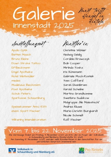 Vom 07.11.2025 bis zum 22.11.2025 lockt eine seit Jahren sehr beliebte Aktion in die Rintelner Innenstadt. Der Stadtmarketingverein Pro Rinteln e.V. wird in Kooperation mit Unternehmen der Innenstadt wieder die "Galerie Innenstadt" eröffnen. Kunst in der Innenstadt, in so einer Form, ist einmalig in der näheren Umgebung. Rinteln wird damit zu einem attraktiven Anziehungspunkt für Kunstfreunde.