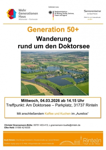 Treffpunkt: Am Doktorsee – Parkplatz, 31737 Rinteln Ort: 31737 Rinteln Organisator: Generation 50+ Mehrgenerationenhaus Rinteln Kontakt: Christel Grannemann-Bülte: 05751 403-413 Elke Held: 01590 4218335 Kategorien: Freizeit & Sport, Senioren Kommentare