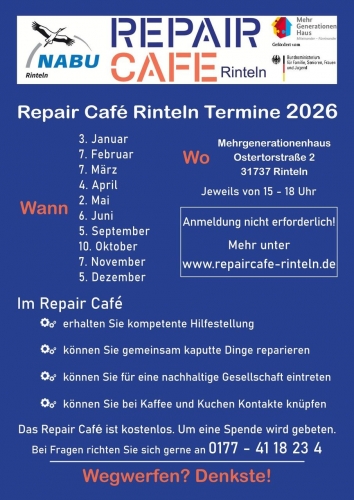 Das Reparatur-Café findet an jedem ersten Samstag im Monat von 15 - 18 Uhr im Mehrgenerationenhaus in der Ostertorstraße 2 in Rinteln statt. Dieses Angebot ist eine Veranstaltung des NABU Rinteln in Kooperation mit der Stadt Rinteln.
