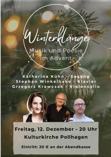 Lassen Sie sich von einem stimmungsvollen Konzert in der Vorweihnachtszeit verzaubern und genießen Sie einen musikalischen sowie poetischen Abend voller bekannter (Weihnachts-)Melodien aus den Bereichen Klassik, Pop und Jazz sowie kleinen winterlichen Anekdoten, Geschichten und Gedichten.